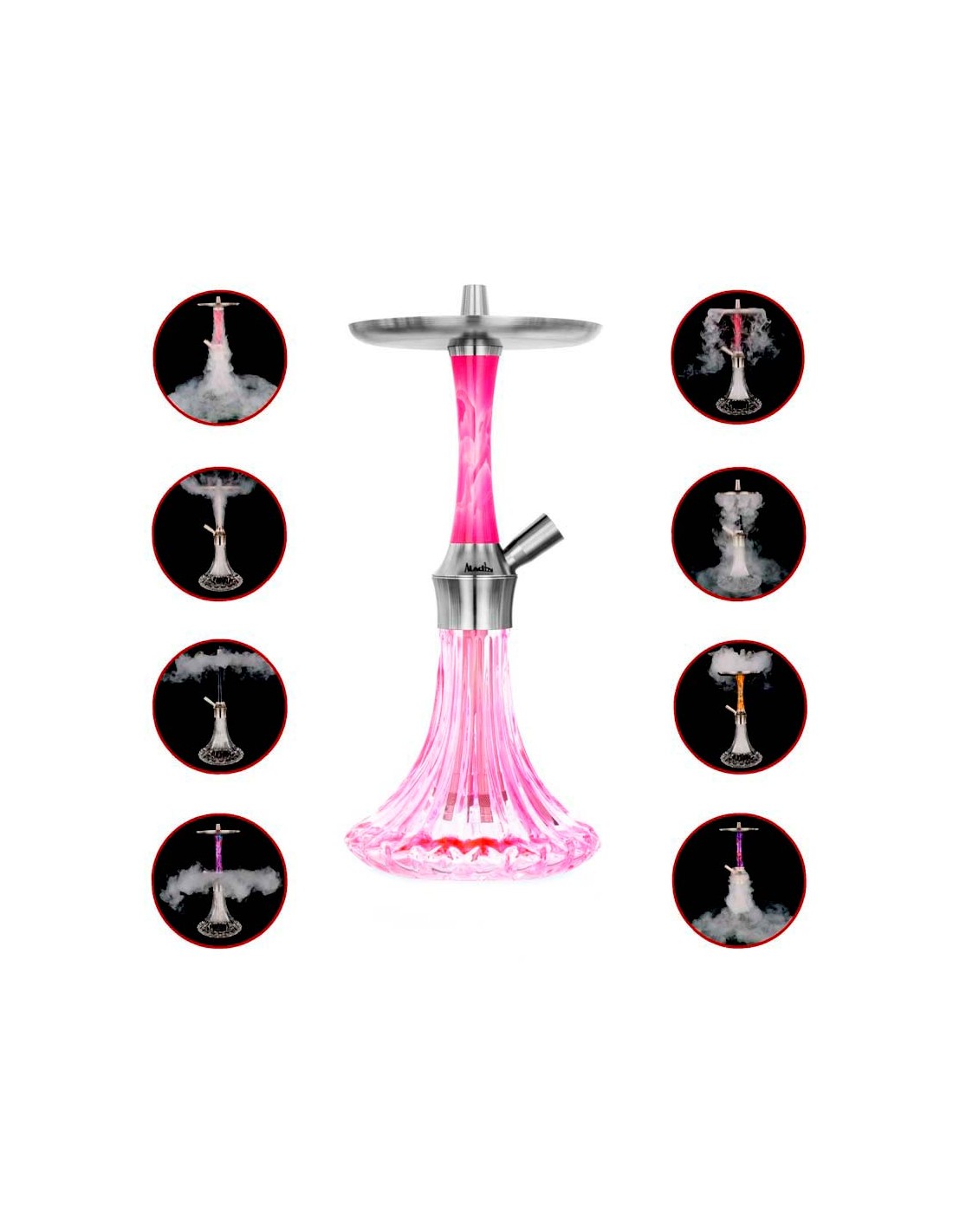 Entre nuestras opciones más populares encontrarás la Aladin MVP 460, una cachimba de tamaño medio con un excelente equilibrio entre estética y rendimiento, o la Aladin EPOX 360, perfecta para quienes buscan un diseño más llamativo con materiales premium.